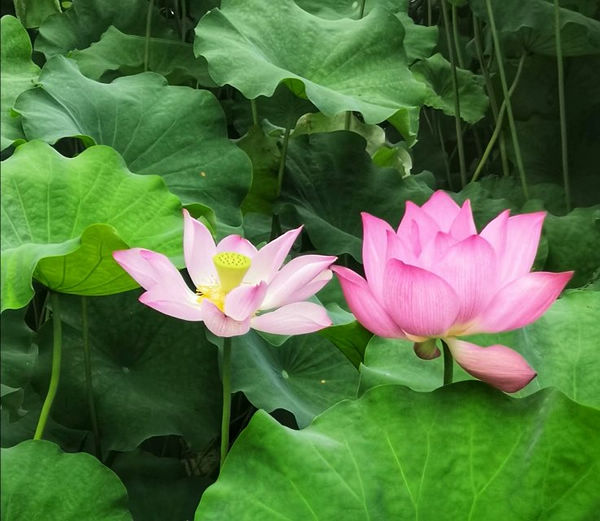 來(lái)到荷塘邊扶欄而望,滿眼的碧綠荷葉層層疊疊,猶如一把把圓傘撐開在水面上,荷葉上晶瑩的水珠,仿佛是落在綠色盤子里的珍珠,盡顯它獨(dú)特的靈氣。再看看那被一根根綠色梗子撐著的荷花,高高立在水面上,有的綠中帶紅,含苞待放;有的只開兩三片花瓣,略顯嬌羞;而那全開的荷花,露出嫩黃色的花蕊和小蓮蓬傲然地向我們展示著它們最美的面容,讓人賞心悅目,陶醉其中!微風(fēng)吹來(lái),那碧綠舒開、裊裊婷婷的荷葉,亭亭玉立、纖塵不染的荷花,隨風(fēng)搖曳,婀娜多姿,寧?kù)o而柔美,高潔而清雅,充滿詩(shī)情畫意……
