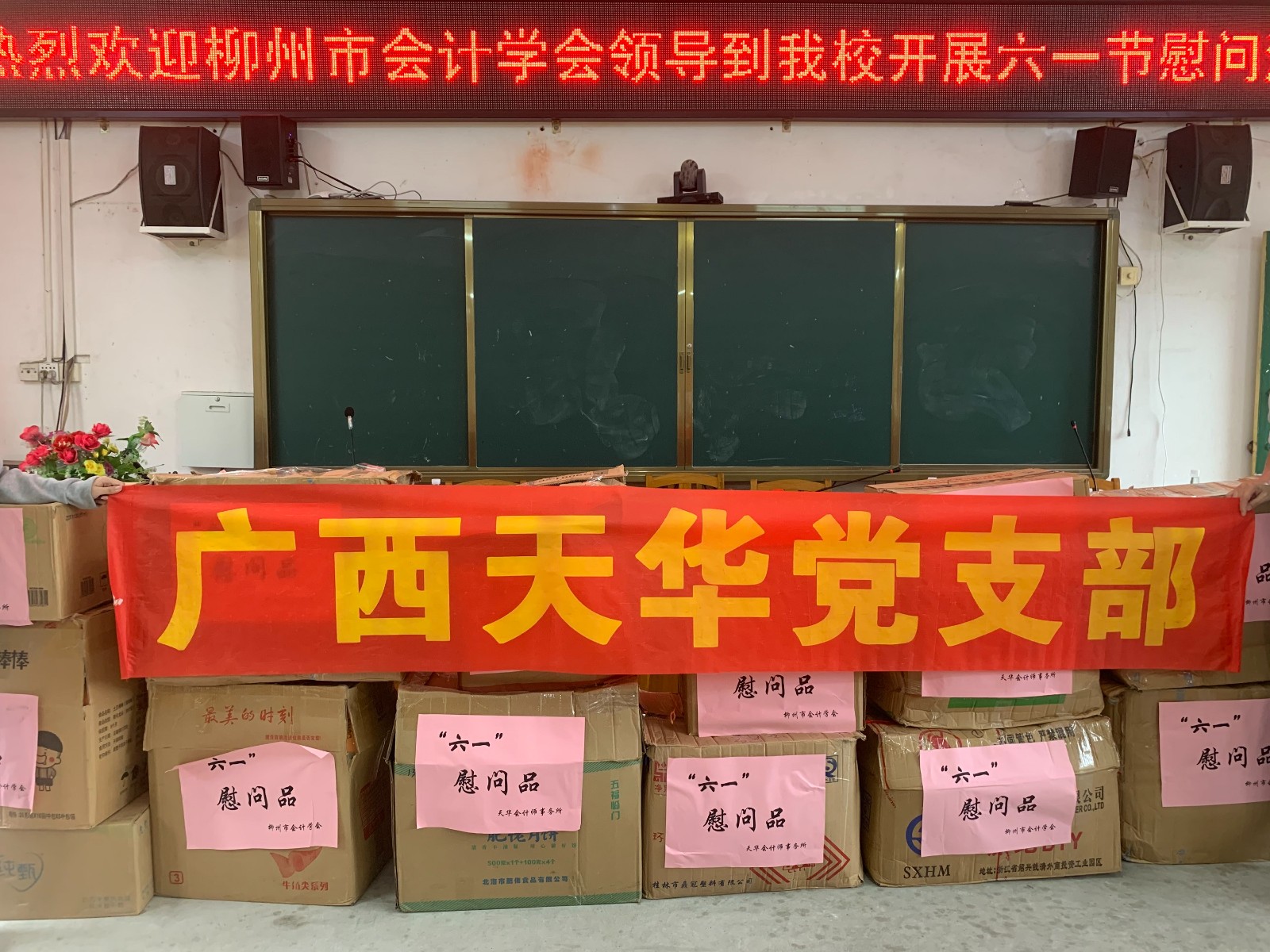 短暫的課間結束之后,孩子們迎來了捐贈儀式。在捐贈儀式上,李驊會長代表柳州市會計學會向孩子們傳遞了節日的問候,并祝愿孩子們能夠在未來的學習日子里奮發向上,好好學習,不辜負社會各界人士對農村教育的關心與幫助。同時,李驊會長也鼓勵老師們扎根農村,為孩子們播下希望的種子,為祖國的教育事業添磚加瓦。八江鎮黨委書記榮任在發言中,向會計學會對八江教育的關愛與幫助表示感謝,他希望通過此次愛心活動能夠讓孩子們學會“感黨恩,聽黨話,跟黨走”,珍惜現在的幸福生活,努力學習,在未來建設祖國時貢獻自己的力量。此外,八江鎮中心小學執行校長吳明輝校長也就此次活動,鼓勵全體師生以此為動力,要熱愛工作,刻苦學習,報效祖國;六(6)的莫紹彤同學作為本次活動的學生代表,也向會計學會慰問團及愛心人士表達了感恩之情。